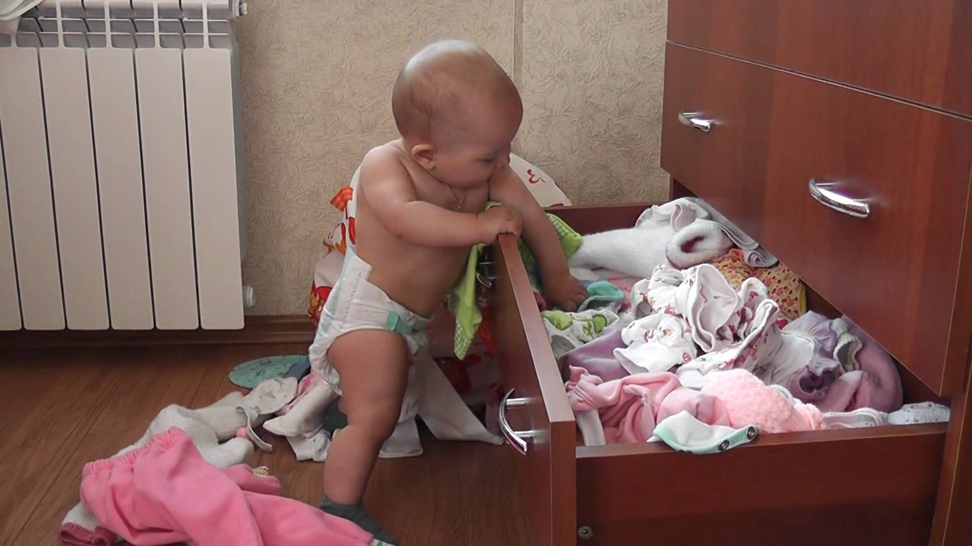 Когда ребёнок стремится научиться одеваться и раздеваться самостоятельно, не препятствуйте ему. Подскажите, как делать правильно, но вовсе запрещать не стоит. Сразу объясните малышу, как и куда складывать вещи, чтобы не было бардака.