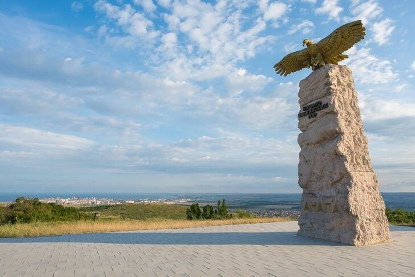 Эту знаковую достопримечательность, установленную на смотровой площадке, откуда открываются потрясающие виды на окрестности Анапы, город обрел летом 2013 г. На вершину постамента из скальника, имитирующего остроконечный утес, помещена фигура орла, величаво раскинувшего крылья. Скульптура, изготовленная из металлопластика, которому не страшны перепады температур и осадки, окрашена под позолоту. Место для размещения памятника выбрано не случайно. Именно здесь из бескрайних кубанских степей начинают подниматься ввысь отроги Кавказских гор.