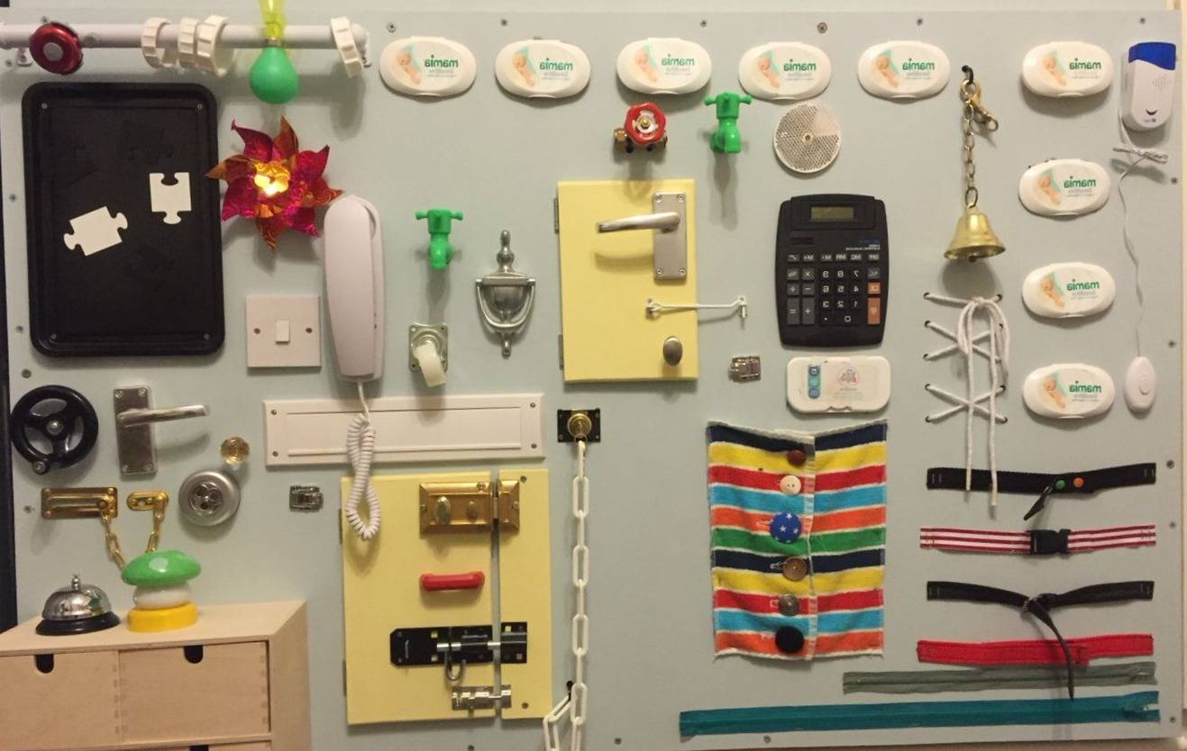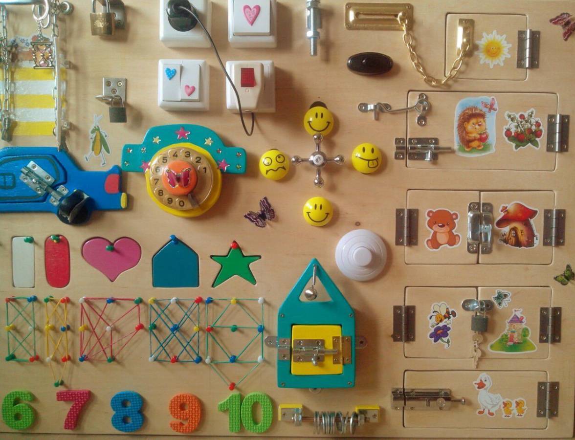Развивающий бизиборд легко сделать своими руками. При этом на доске можно разместить те предметы быта, детали интерьера и другие элементы, которые интересуют конкретного ребенка. Особой популярностью пользуются именные бизиборды.