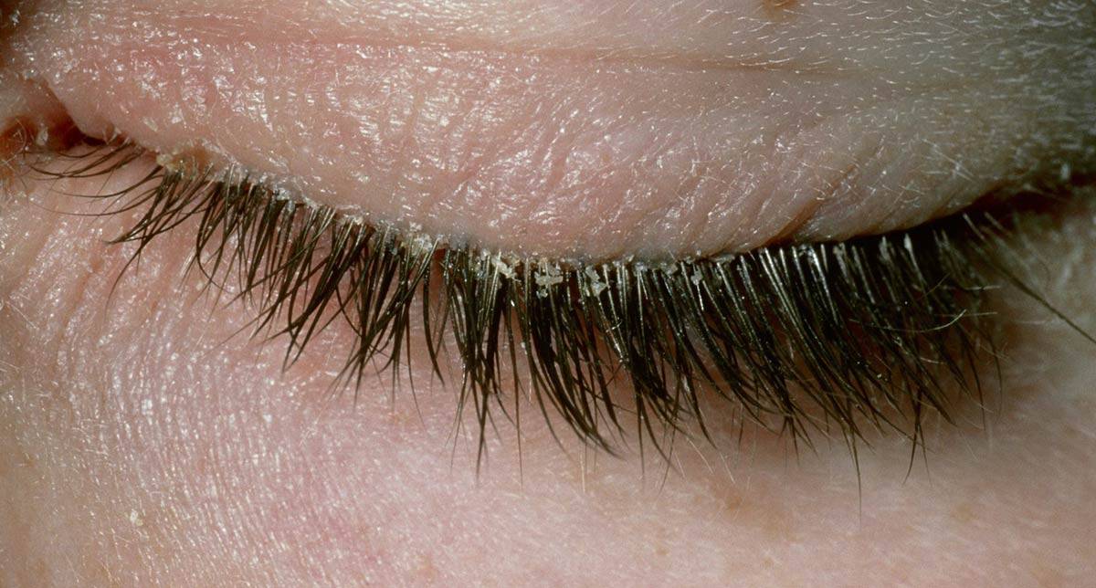 - кожа в районе глаз покрывается чешуйками, на ресницах появляется перхоть;