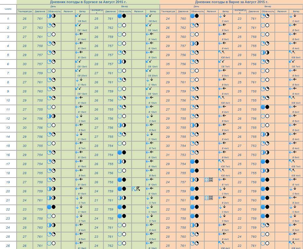 Купальный сезон в Болгарии начинается примерно с середины июня. К этому времени море успевает прогреваться до 22-23 градусов тепла и заканчивается в начале октября. Для сравнения, добавляю картинку архива погоды для Бургаса и Варны за август 2015 года.