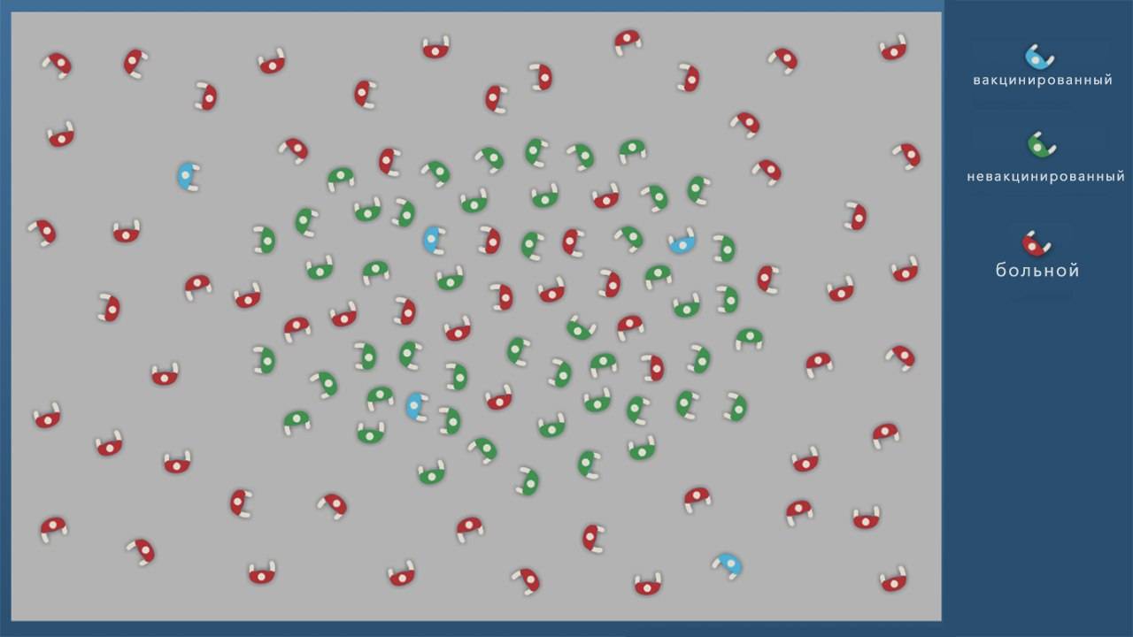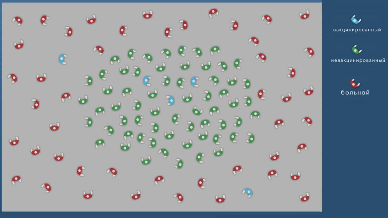 Формирование коллективного иммунитета. Когда большая часть (не менее 70%) населения привита, инфекция перестает распространяться, и новых случаев заражения нет. При этом вакцинированные люди защищают непривитых, составляя их ближайшее окружение (рис. 1)