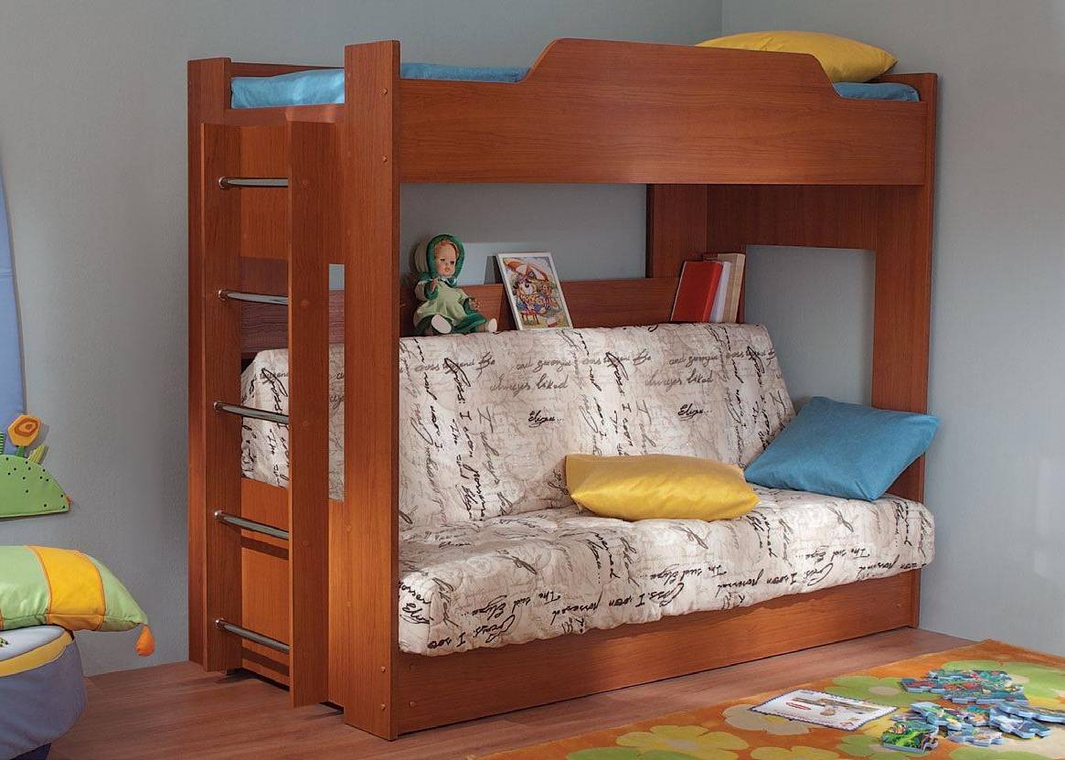 1. Выдвижной. При таком устройстве одно спальное место выдвигается на колесиках из-под другого. В сложенном состоянии конструкция представляет собой небольшой диван. Модель может быть оборудована шкафами, стеллажами, что повышает ее функциональность.