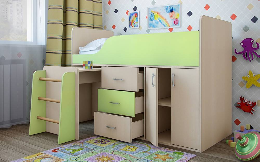Детская комната мала для размещения кровати и рабочего стола ребёнка? Это не проблема. Модель с размещением спального места ребёнка на верхнем ярусе, позволит вам вместить всё необходимое в комнате ребёнка. В том числе и шкаф для одежды и при этом не займёт места больше обычной кровати.
