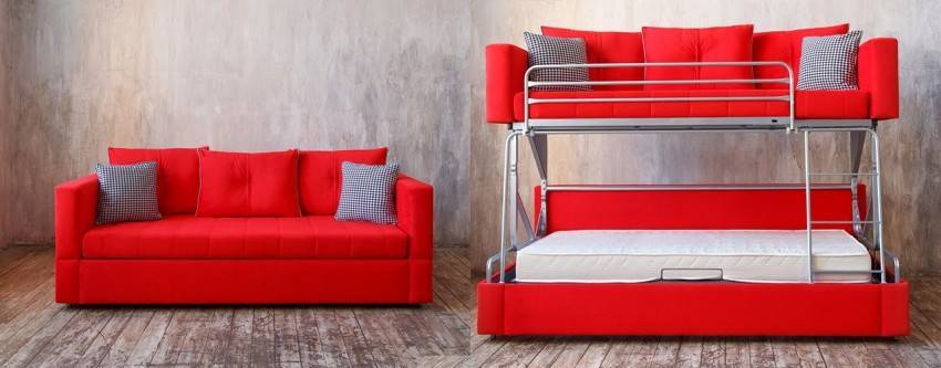 3. Диван, трансформирующийся в двухъярусную кровать. Этот вид мебели появился недавно и не так популярен из-за своей высокой стоимости. В собранном виде он выглядит как обычный диван, и никто не догадается, что этот предмет интерьера может мгновенно превратиться в двухуровневую кровать. Еще один недостаток – более сложная разборка. Маленькие дети вряд ли справятся без помощи взрослых с этим механизмом.