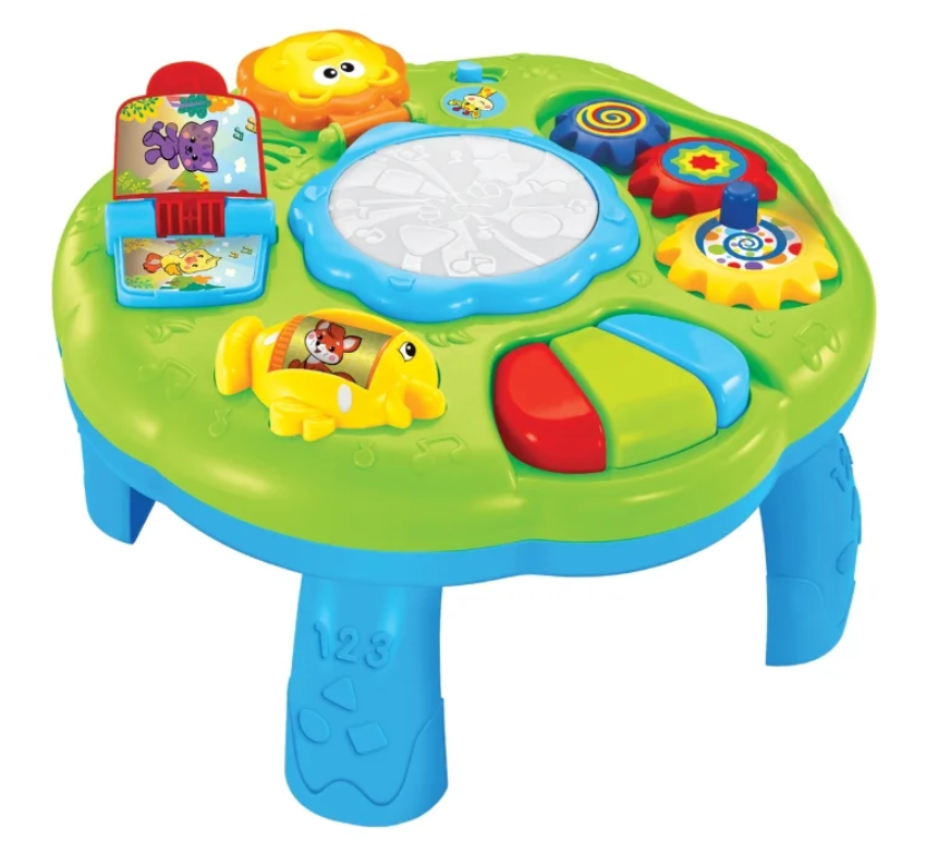 Стол отсоединяется от ножек и может крепиться к стенке кровати за ремешки. Работает изделие от трех батареек типа АА. Диаметр стола – 30 см. Выполнен он из пластмассы. Игрушка рекомендована детям от 9 месяцев. Ее выбирают за многофункциональность и привлекательный дизайн. Средняя цена – 1500 рублей.