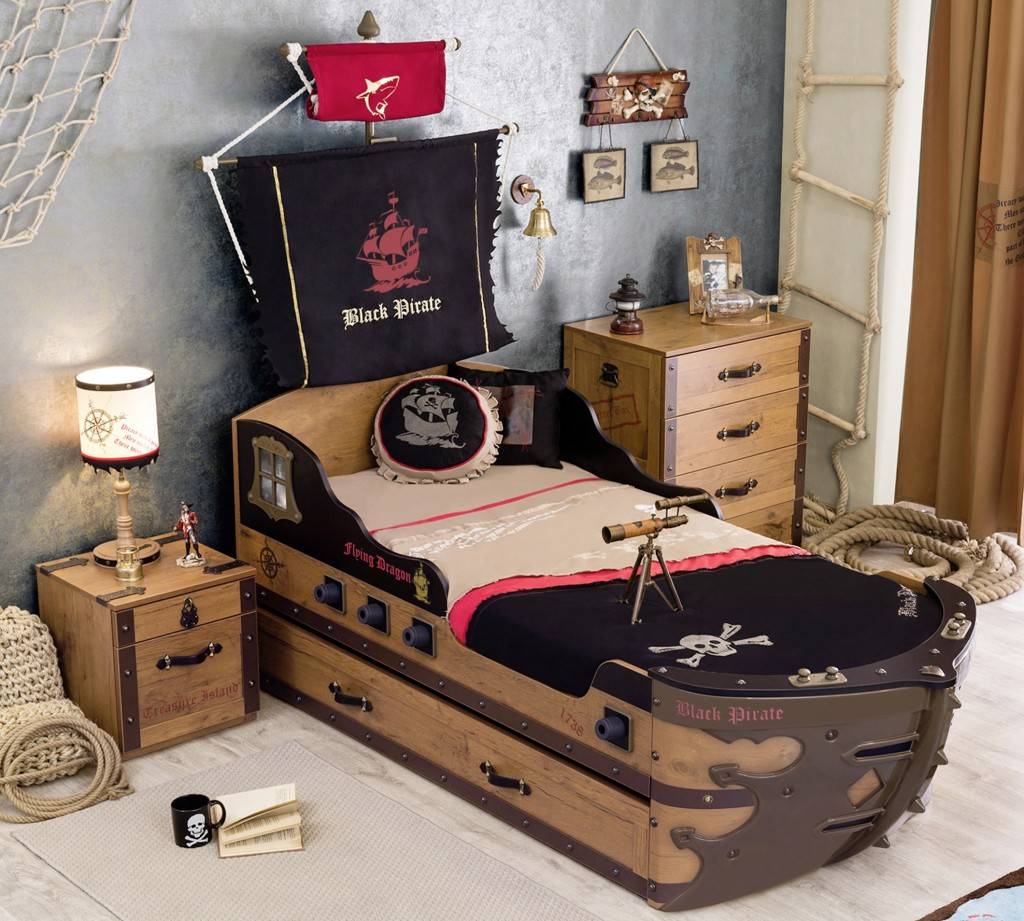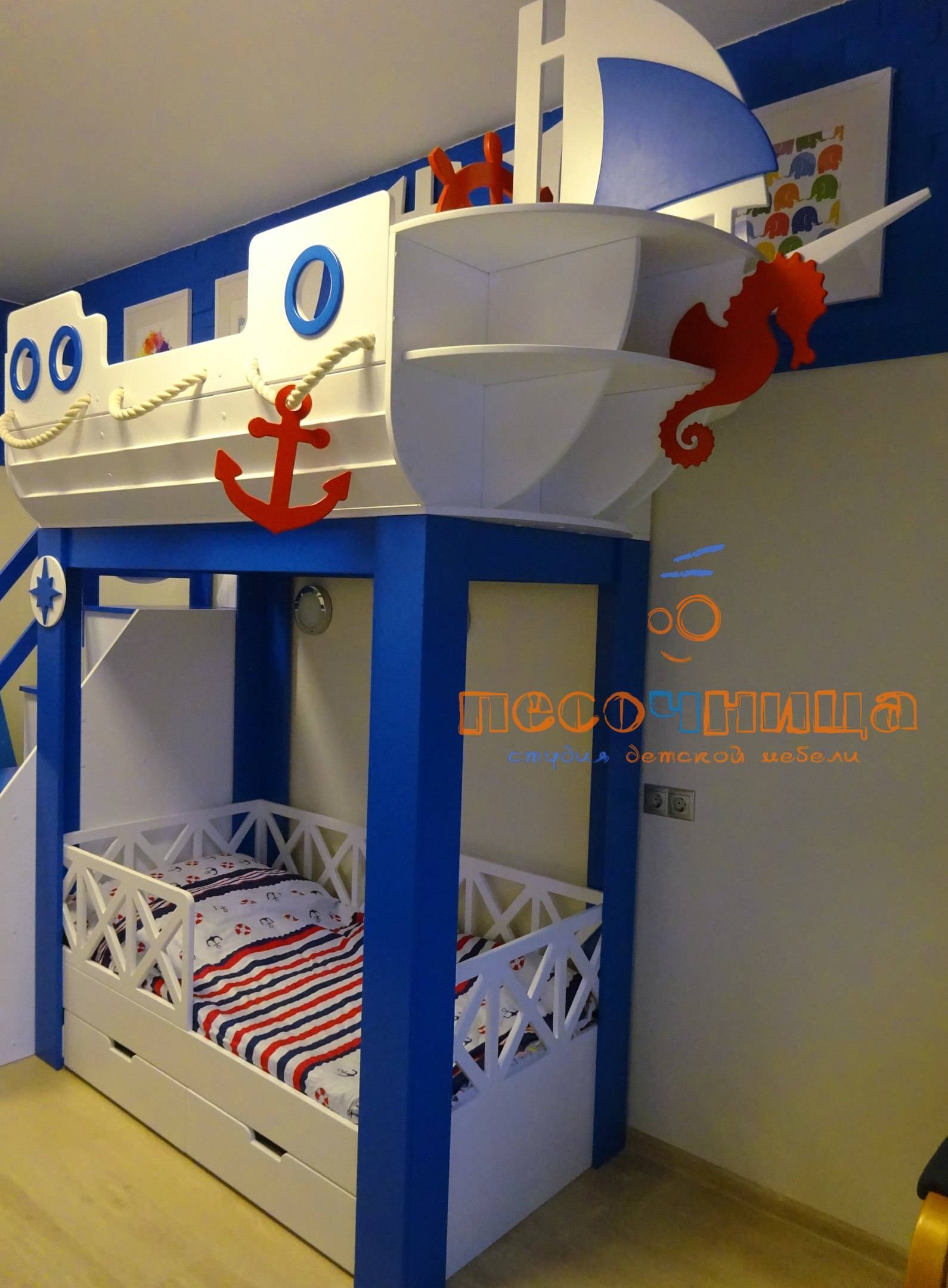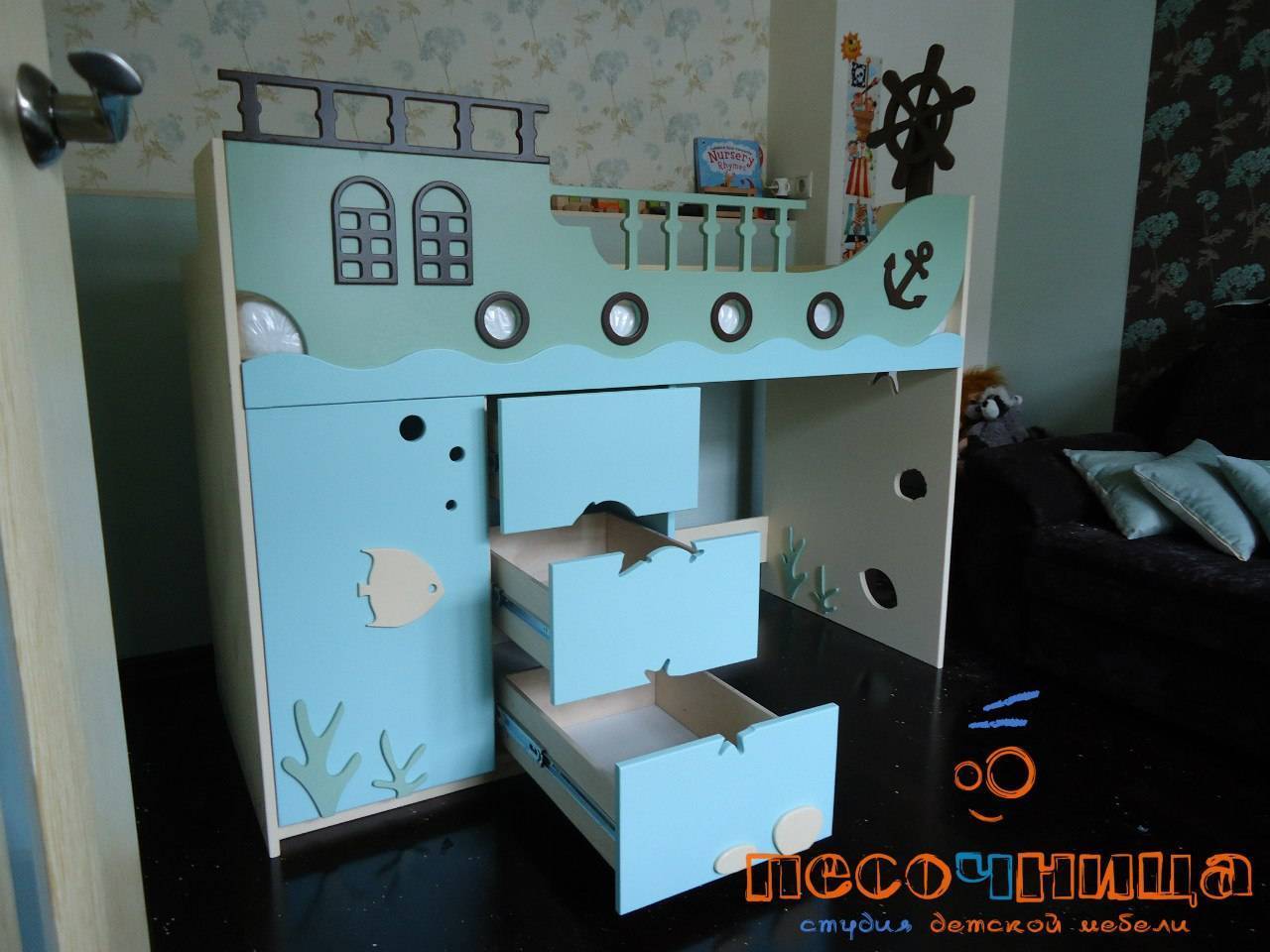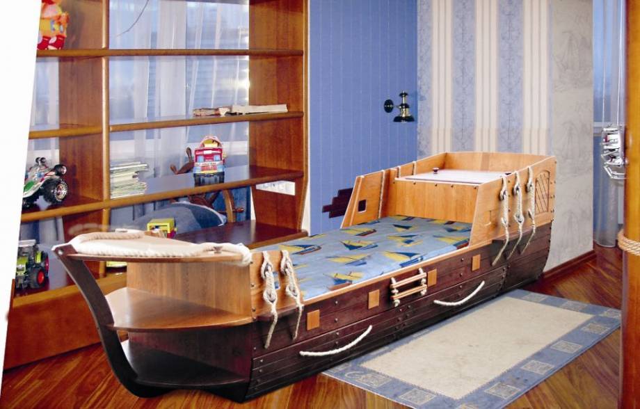 Кровать-корабль — это не только красивый элемент интерьера, но и многофункциональное дизайнерское решение. Нижняя часть «палубы» укомплектована выдвижными шкафами, которые помогут содержать «каюту» в чистоте и порядке, а наличие полок по бортам или в носовой части позволит украсить кроватку любимыми книжками, географическими атласами, картами. В дополнение к заданному стилю интерьер можно дополнить компасом и биноклем.