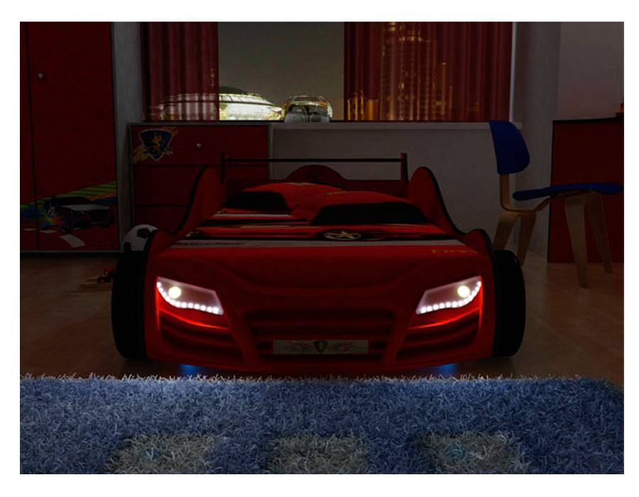 Круговая подсветка, светящиеся фары (обычно с пультом-ключом дистанционного управления) имеют не только декоративный эффект, но и помогут малышу добраться до постели при выключенном свете.