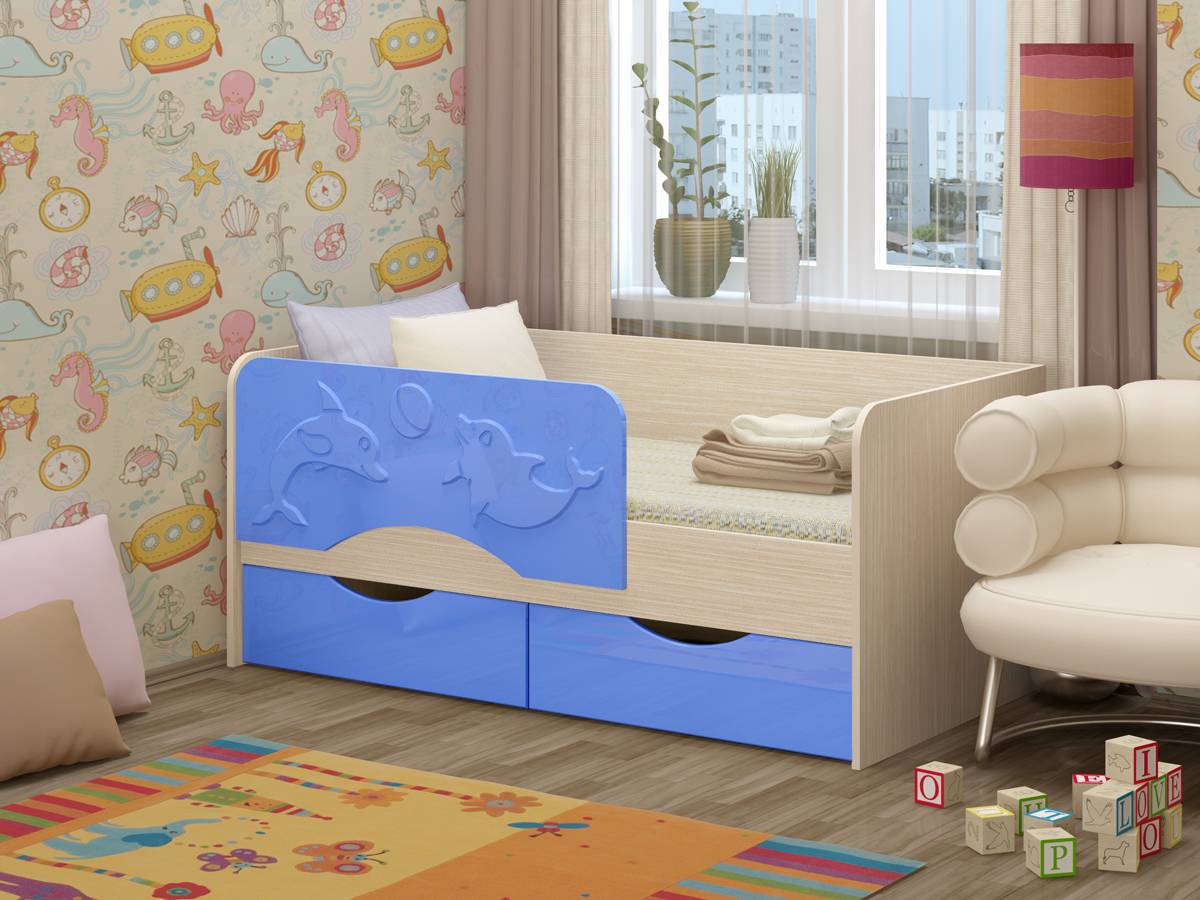 Дельфин, изображенный на лицевой стороне кровати, не только привлекает внимание ребенка, но и придает спальной комнате ребенка детский игровой вид