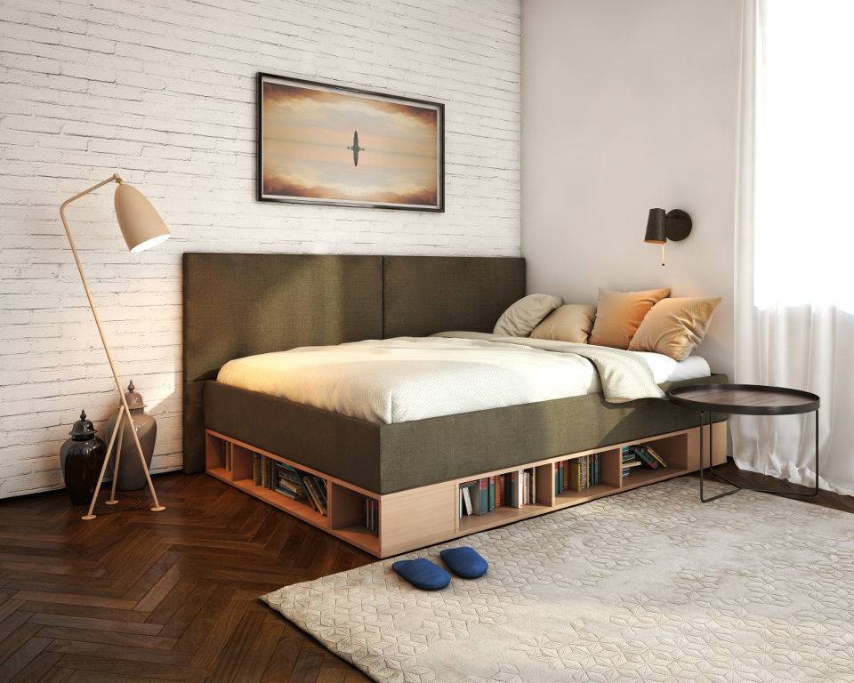 Кровать с наличием отсеков решает проблему хранения вещей. Каркас таких моделей выполняется из плотного дерева. Благодаря своим экологическим свойствам, белье, хранимое в секциях, не сыреет и не приобретает затхлый запах. Обивкой для мебели с подъемными устройствами служит плотный материал. От его качества зависит долговечность и внешний вид изделия.