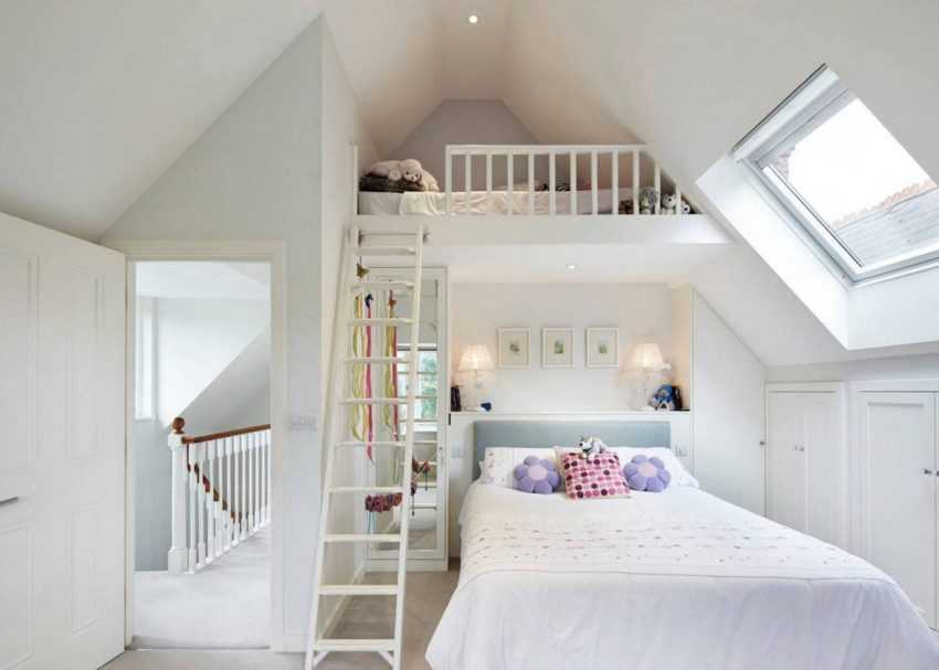 Скошенные потолки на мансарде делают помещение более таинственным и необычным. Однако здесь могут возникнуть определенные сложности с выбором кроватки, например, двухуровневую или кровать-чердак можно использовать только при достаточной высоте потолков.