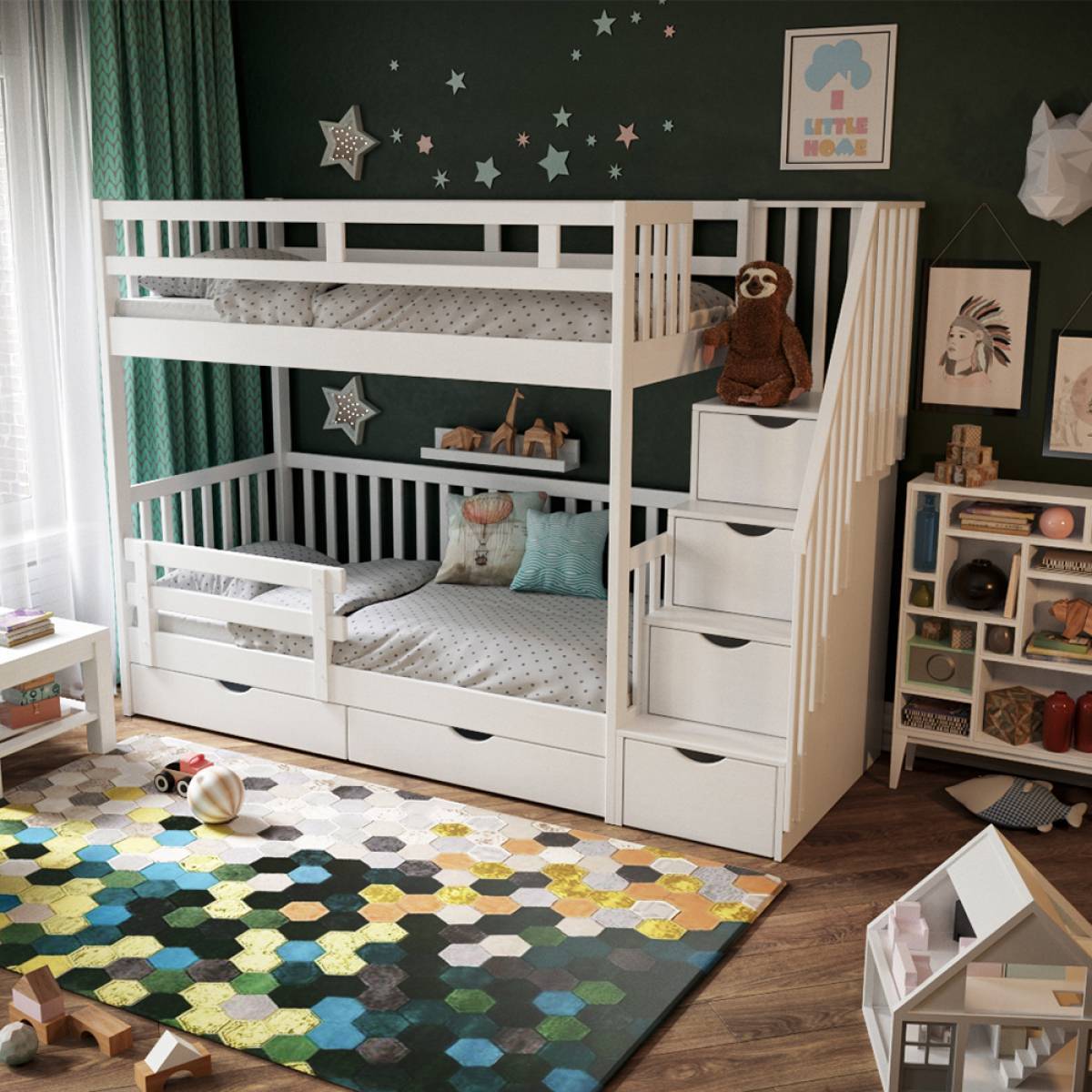 Это может быть комплекс из одной стационарной и одной подъемной моделей. Такой вариант удобен тем, что две разложенные спальных зоны не будут занимать много места во время активных детских игр, но в то же время в комнате сохраняется еще одно спальное место, где дети смогут отдохнуть или поспать.