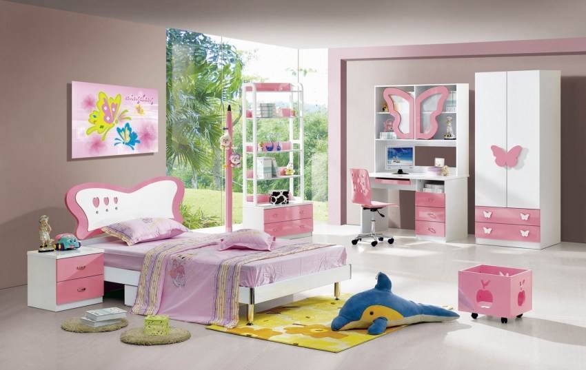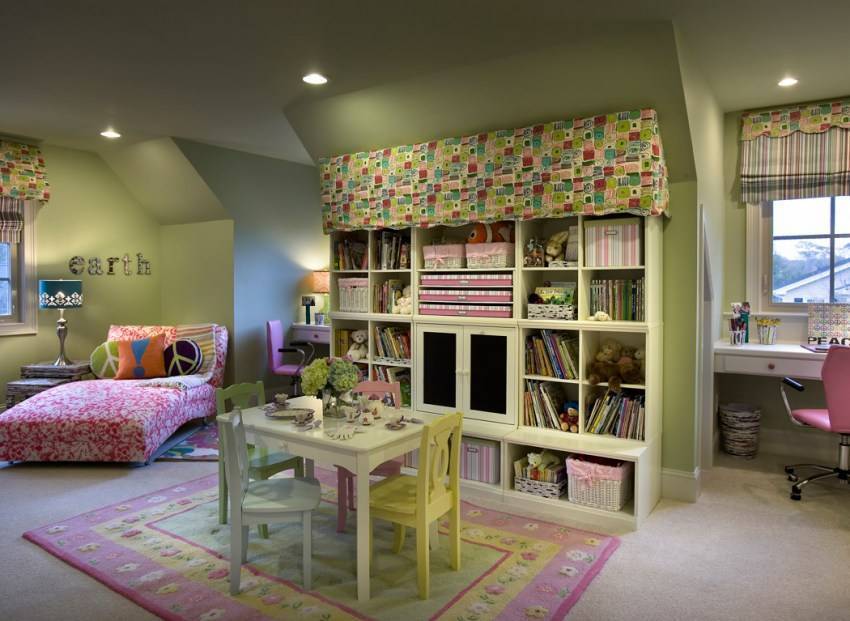 Такая комната нуждается в индивидуальном оформительском подходе, например, для старшей девочки школьного возраста следует устанавливать вместительные конструкции, в виде стеллажей, ящиков и полок, подходящих под книги, тетради или канцтовары, а для младшей сестренки выделять систему хранения для игрушек, кукол, альбомов с рисунками и прочих вещей.
