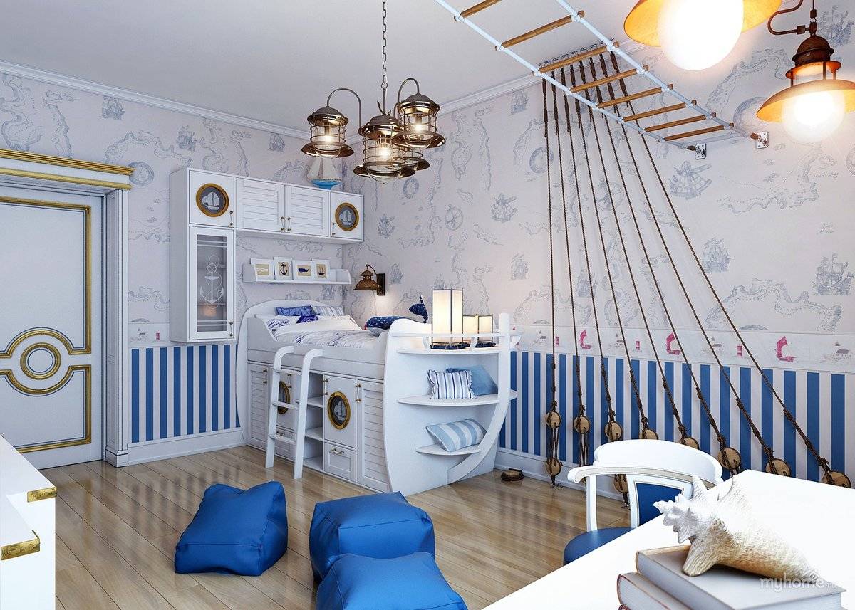 Комнату для мальчика подростка можно стилизовать под каюту юнги с кроватью-гамаком и подвесными полками на канатах, декорированные большими морскими раковинами, компасом, песочными часами, старинными лампами и книгами. Прекрасным дополнением морского интерьера станут необычные шторы-паруса.