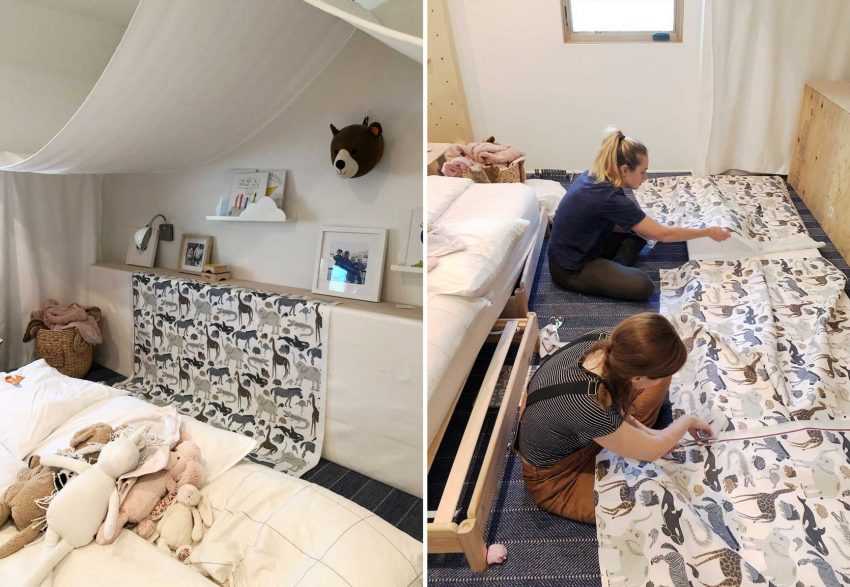 Если размеры помещения позволяют, нужно разделить части девочки и мальчика с помощью перегородок, мебели или занавески