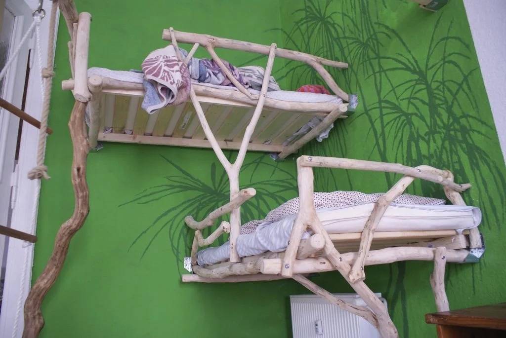Вариантов дизайна спального места существует огромное множество. К примеру, каждый в детстве мечтал о маленьком уютном домике на дереве. Необычную детскую кровать можно расположить под потолком, в верхней части дерева, оплетенной ветками, которые использовать в качестве полок для книг и журналов. Украсить их скульптурками птичек и светодиодной лентой. Ствол можно дополнить удобной лестницей.