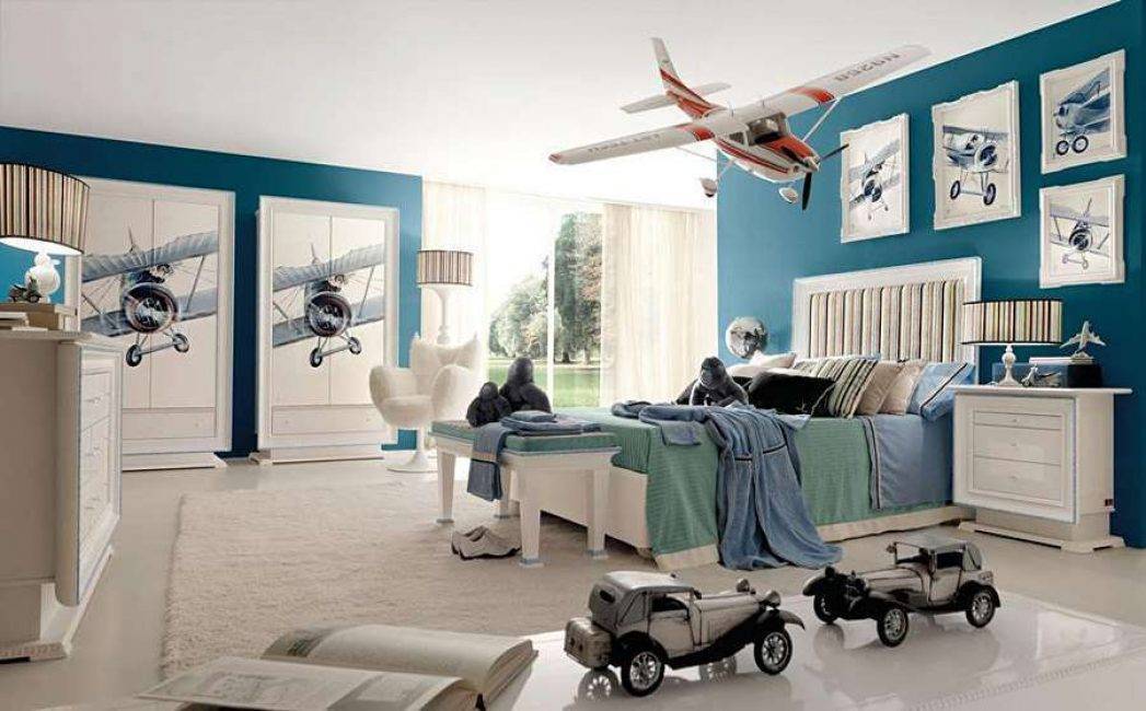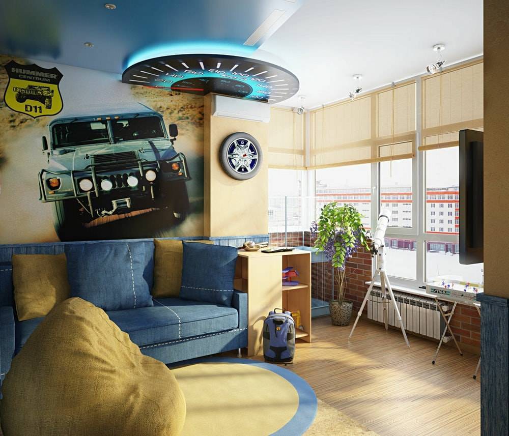 Для таких интерьеров подойдут обои с изображение ретро-автомобилей, самолетов, химических формул, молекул ДНК и всего того, что связано с техникой и научной сферой. На одной из стен можно изобразить контур самолета или машины, который будет светиться в темноте.