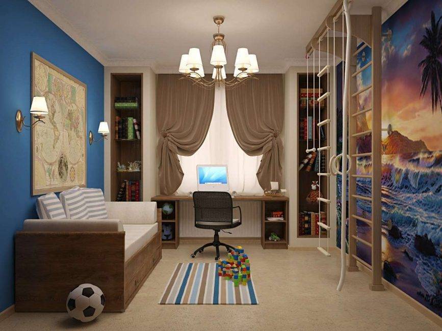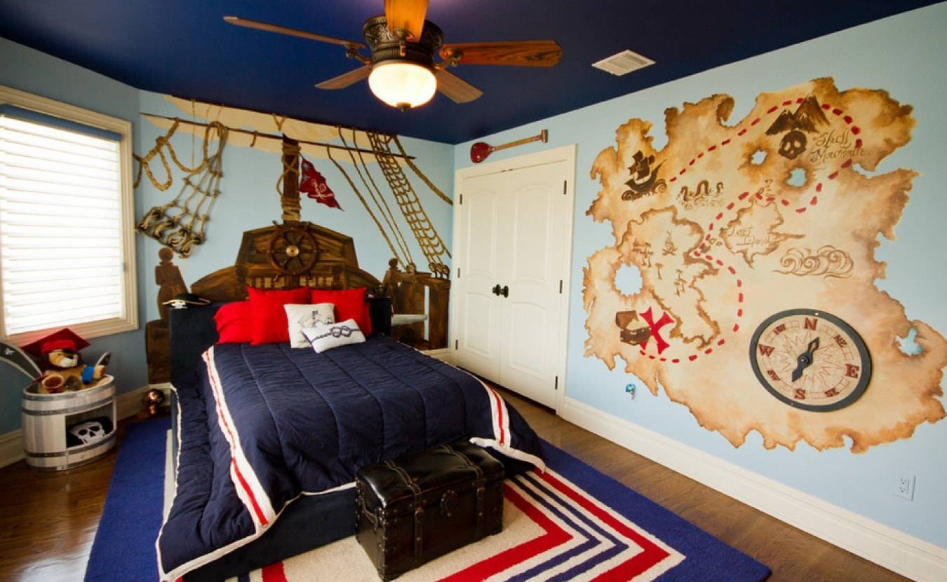Комнату для мальчика от семи до двенадцати лет можно оформить, взяв за основу его литературные предпочтения. В это время ребенок может зачитываться книгами о пиратах или фантастическими романами. Если мальчику интересен мир флибустьеров, то приобретите ему обои с изображением пиратской бригантины или каравеллы. Рядом с такими фотообоями можно соорудить спортивный уголок, где мальчик будет карабкаться по канатам и представлять себя на настоящем паруснике.
