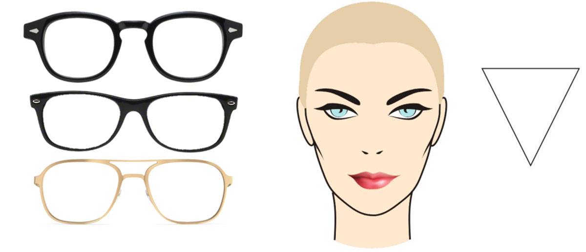 У обладателей треугольного лица обычно узкий лоб с выразительными скулами, переходящими в небольшой подбородок. Уменьшить верхнюю часть лица, а также в целом гармонично выровнять пропорции, помогут каплевидные очки и «кошачий глаз» со светлыми стеклами, не имеющими обрамления. Лучше не надевать оправы квадратной или прямоугольной формы — они визуально утяжелят лицо, сделав его неэстетичным.