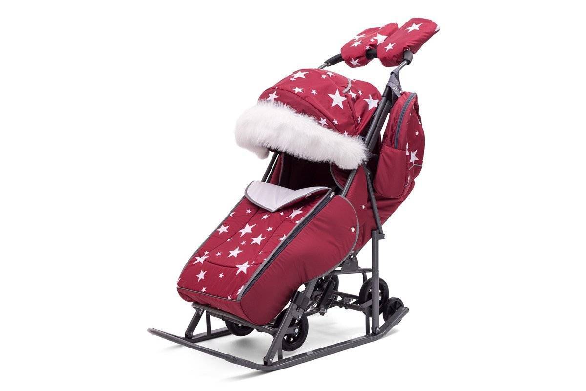 | Санки-коляски | Прочные. При правильном уходе могут служить долго. | Мягкое сиденье и подножка для удобства. Есть ремни безопасности. | Металлический каркас подвержен коррозии. |