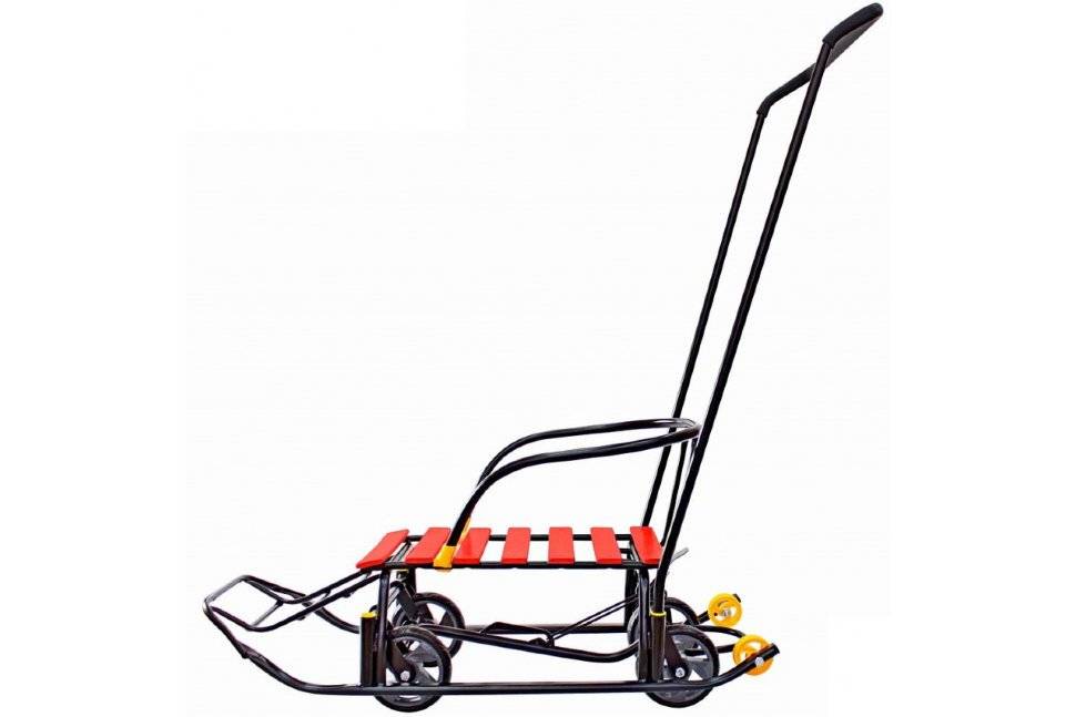 Первая в России модель саней, оснащенных выдвижными колесиками. Механизм переключения колес очень надежно выполнен, он никогда не складывается самопроизвольно. А широкая колесная база делает конструкцию устойчивой, и сани не заваливаются на бок. Максимальная нагрузка, которую она может выдержать, составляет 140 кг. Изделие подходит как для детей от 3 лет, так и для взрослых. Основа выполнена из металла, сиденье реечное. В комплект также входят: