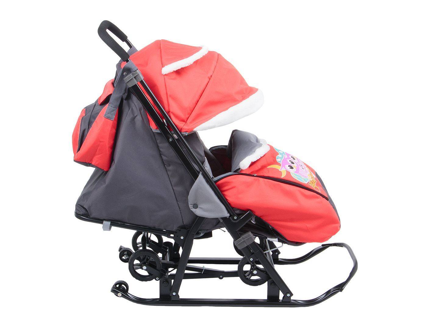 Хорошая альтернатива коляске в зимнее время. Легковесная конструкция легко передвигается по снегу и не застревает. Изделие оборудовано 4 выкатными колесиками. Это позволяет без труда переходить дорогу и въезжать в помещение. Специальный механизм складывания очень простой и не требует больших усилий при использовании. При этом, санки отличаются современным дизайном, что делает их одним из лидеров продаж. Спинка фиксируется в 4 положениях, от сидячего до лежачего. Изделие оборудовано теплым вкладышем и ножным чехлом. Есть и специальные теплые варежки для мамы. Имеется также подножка, регулируемая по высоте. Безопасность ребенка обеспечивается 5-точечным фиксирующим ремнем. Рама стальная, текстильные детали изготовлены из Dewspo — горнолыжной ткани. Приятный бонус — наличие в комплекте удобного рюкзака для необходимых мелочей.