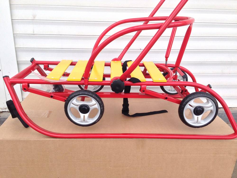 Санки оснащены надежным металлическим каркасом, широкими полозьями с двумя крошечными колесами. Дизайн простой, но приятный.