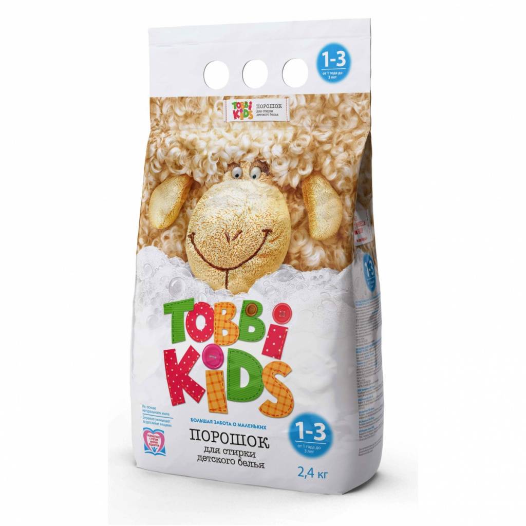 Tobbi Kids − стиральный порошок на основе хозяйственного мыла и соды получило признание у российских мам, благодаря безопасному составу и эффективному отстирыванию самых сложных пятен. Оно не содержит энзимы, отдушки, анионные ПАВы. Его водородный показатель соответствует pH коже малыша.