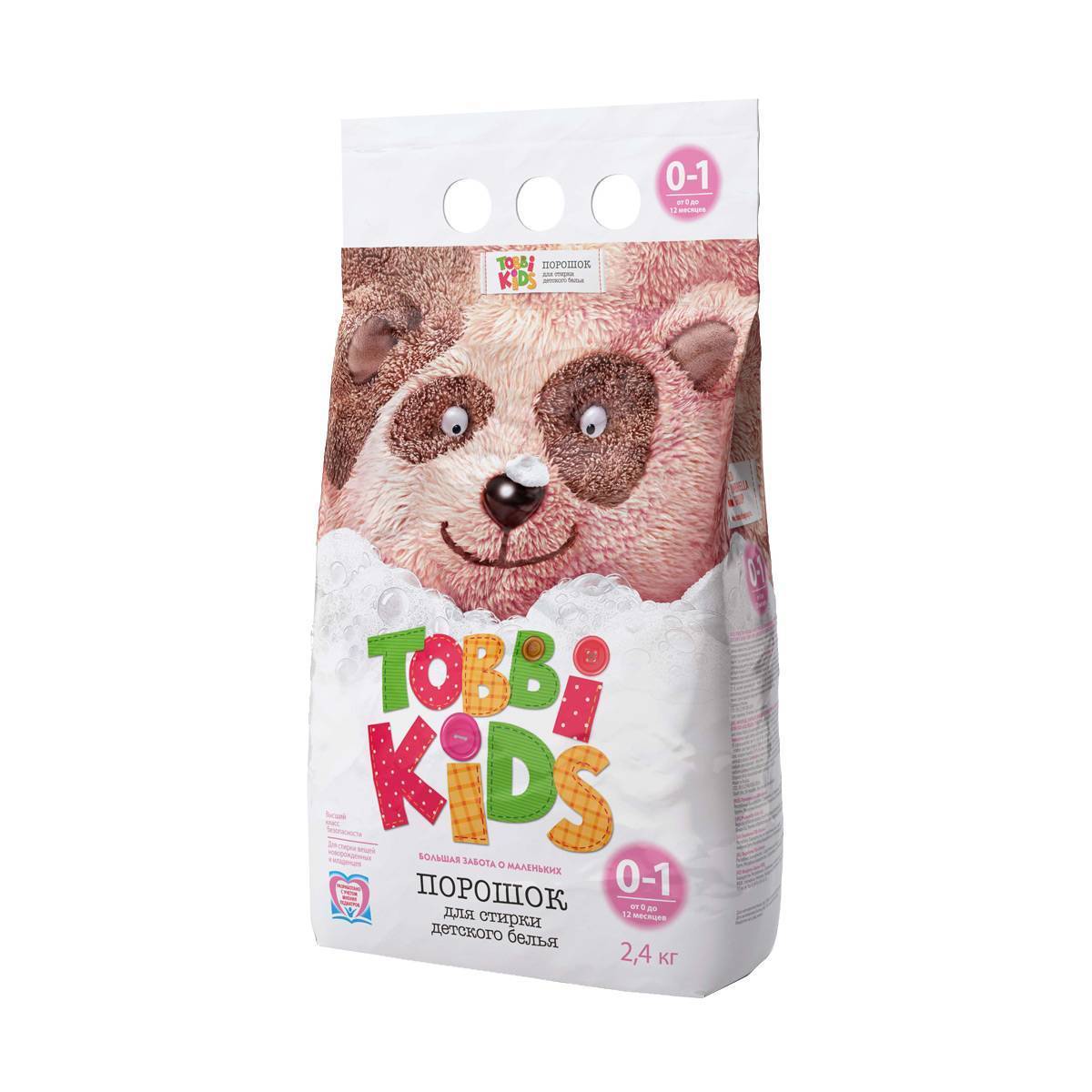 Tobbi Kids − стиральный порошок на основе хозяйственного мыла и соды получило признание у российских мам, благодаря безопасному составу и эффективному отстирыванию самых сложных пятен. Оно не содержит энзимы, отдушки, анионные ПАВы. Его водородный показатель соответствует pH коже малыша.