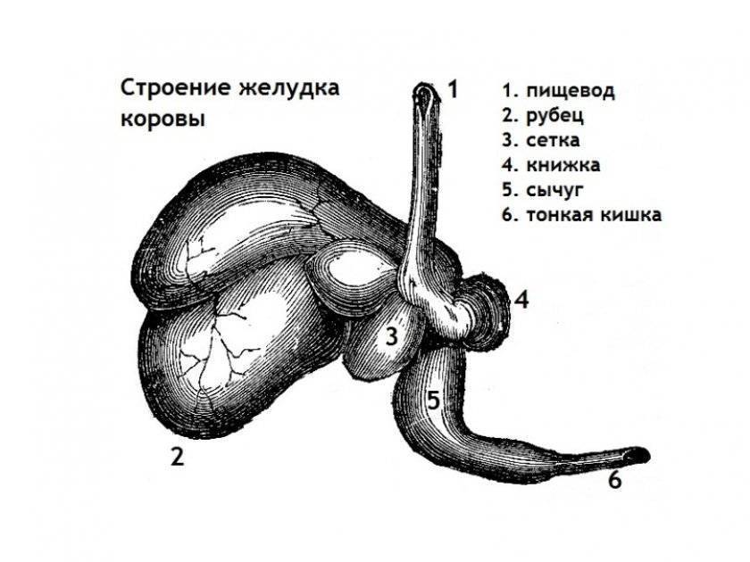 Этот орган пищеварения располагается в центральной и левой частях брюшины коровы. Многих интересует, скольки камерный желудок у коровы. Он состоит из одного истинного желудка, который называется сычуг, и трех вспомогательных преджелудков — рубца, книжки и сетки.