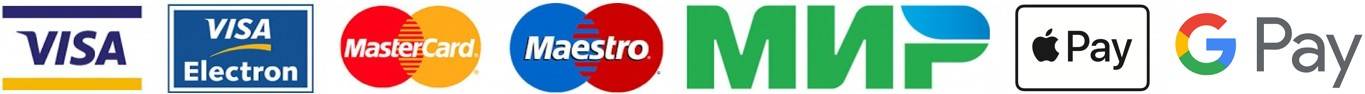 Принимаются к оплате пластиковые карты MasterCard, VISA, Maestro, МИР. Также доступна бесконтактная оплата картами Apple Pay, Google Pay и Android Pay.