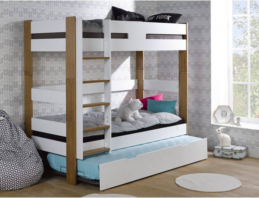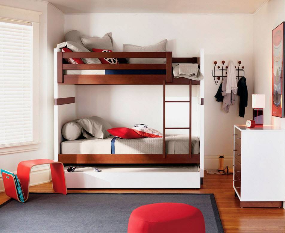 Один из подвидов трехместной двухъярусной кровати – двухъярусная кровать-диван, верхняя часть которой – это кровать, а нижняя, соответственно, – диван. При достаточных квадратных метрах такой предмет мебели может стать функциональным украшением.
