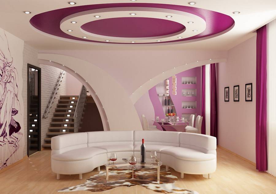 Если вы планируете дизайн потолка в студии, вам потребуется потолок с переходом, который будет зонировать помещение. Переход выделяется с помощью разных уровней и цветов.