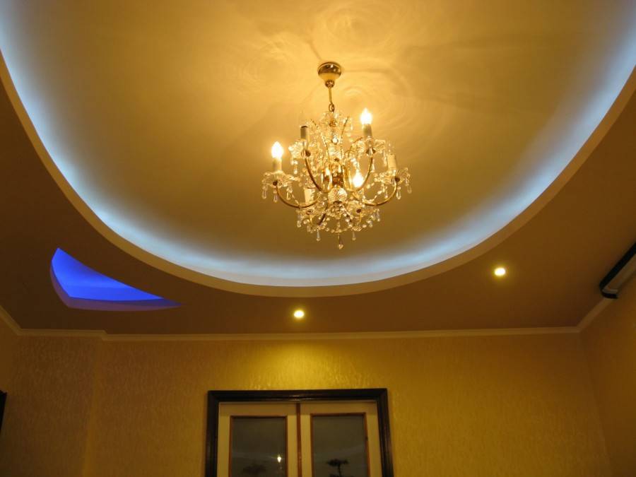 Гипсокартон пластичен и удобен тем, что позволяет включать светильники в орнамент, размещать в объемных элементах, подчеркивать уровни, подсвечивать элементы разными цветами.