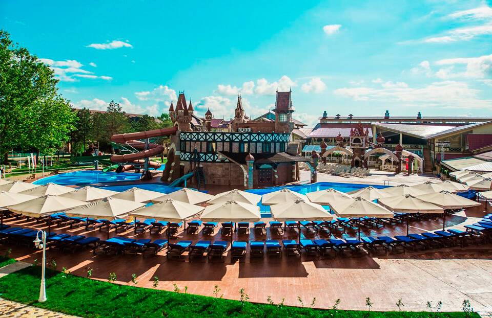 - Комплекс крытых и открытых бассейнов с подогреваемой минеральной водой. Детей, конечно, порадуют бассейны с аквагорками. Всей семьей можно насладиться водными играми и спортивными состязаниями, проводимыми аниматорами отеля в течение дня.