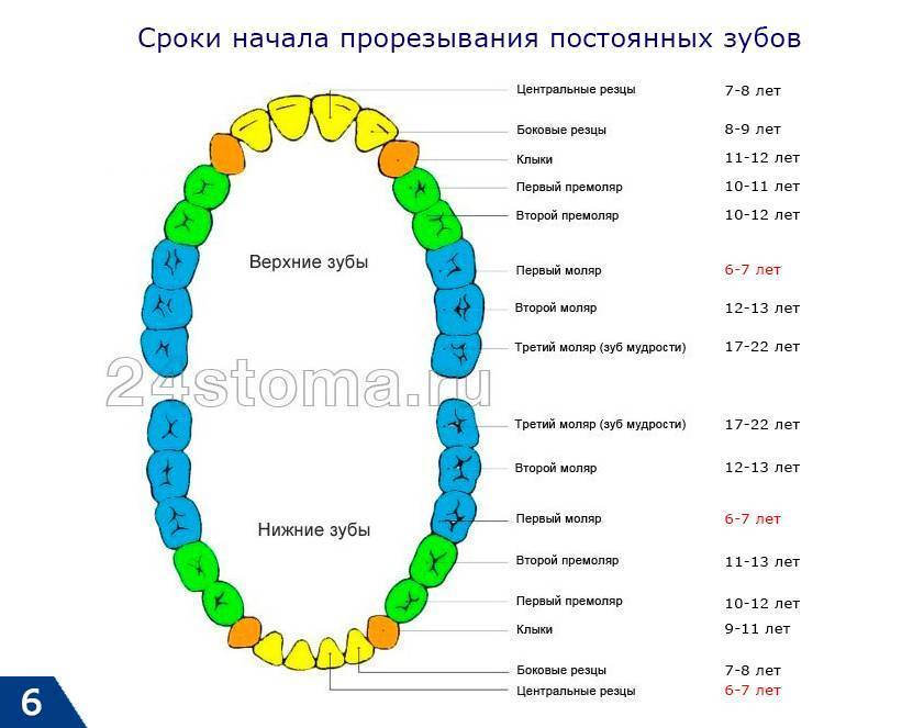Из постоянных зубов первыми прорезываются первые моляры, что обычно происходит в 6 лет. Правда в последнее время прорезывание все чаще начинается в 5 лет, и это связывают с акселерацией физического развития детей. Процесс прорезывания постоянных зубов заканчивается к 14 годам (за исключением зубов мудрости). Зубы считаются полностью прорезавшимися – только когда их жевательная поверхность начинает контактировать с зубами антагонистами противоположной челюсти, а десна обхватывает коронки зубов только в области их шейки.