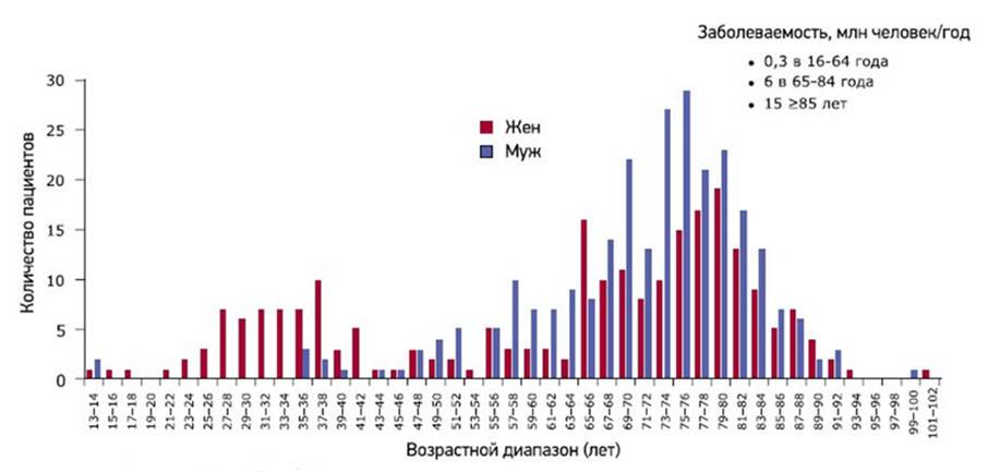 Кроме генетически обусловленных (наследственных) форм выделяют приобретенные формы гемофилии (болезнь Розенталя), в основе которых дефицит фактора ХI и которая относится к группе редких коагулопатий. Приобретенные формы гемофилии встречаются крайне редко и в основе их развития — появление антител к факторам свертывания, что характерно для аутоиммунных/миелопролиферативных заболеваний, гиперчувствительности к лекарственным препаратам, заболеваниям кожи и беременности. Приобретённая гемофилия наиболее распространена в возрастном периоде 69-80 лет, однако среди женщин патология часто встречается в репродуктивном возрасте. В целом распространенность приобретенной гемофилии составляет 1,5 случая/1 млн населения /год (рис. ниже).