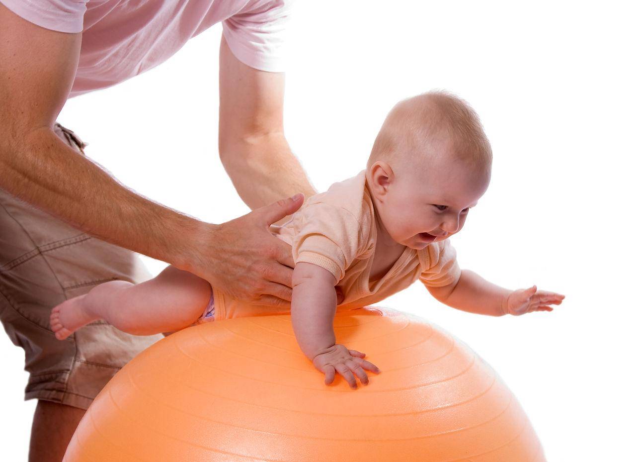 - Выполняем упражнения на мяче. Для этого стелим пеленочку на гимнастический мяч и кладем ребенка на животик. Придерживая его за бока и спинку, прокатываем малыша вперед-назад. Повторяем несколько раз.