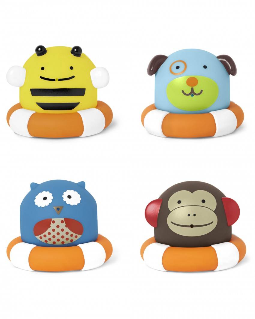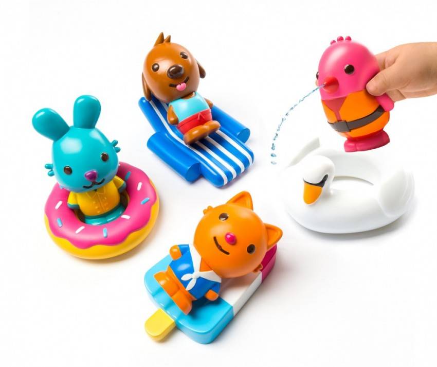 Игрушки отличаются простотой форм, мягкостью, внутри них пустота, поэтому они свободно «дрейфуют» по водной поверхности, что привлекает ребёнка.