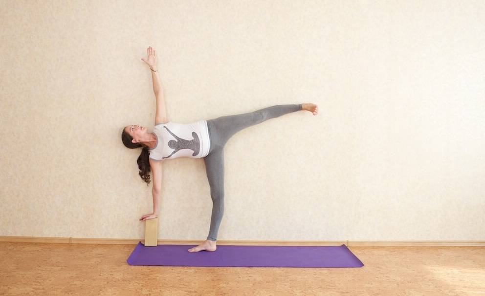- Входить в асану нужно, встав спиной к стене. Блок расположить вертикально, примерно в 20 сантиметрах от правой ступни.