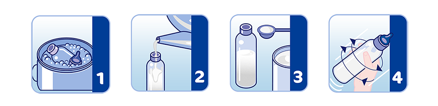 В воду нужной температуры мерной ложечкой насыпают детскую смесь. Берите только сухую ложку! Размешайте порошок, закройте бутылочку и хорошо встряхните, чтобы не осталось комочков. После кормления выливайте остатки, не используйте их в следующий раз!