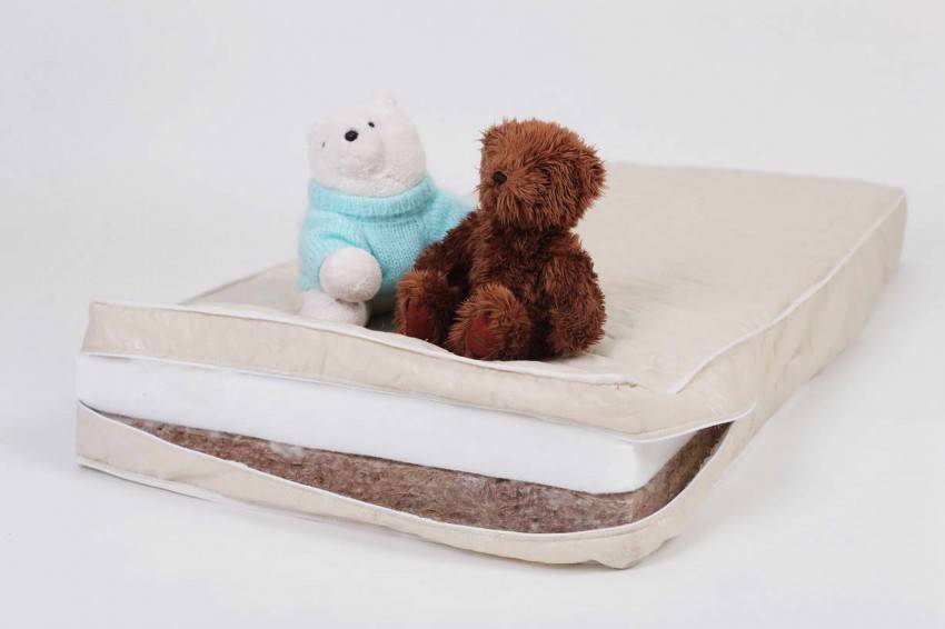 Матрас для новорожденного из кокосовой койры – это самый подходящий вариант. Кокосовое волокно сшивается нитками или сцепляется латексом. Прошитые модели – не самые подходящие, так как кокос будет крошиться и может вызвать у новорожденного аллергию, и более того, они быстро теряют свою форму, поэтому сон малыша уже не будет проходить в самых лучших условиях.