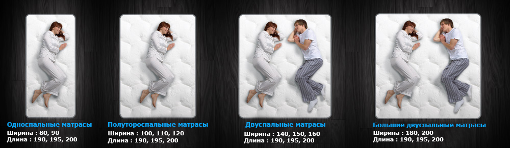 Размеры матрасов для взрослой кровати должны стать гарантией качественного, крепкого и здорового сна. Используются как полуторные, так и двуспальные модели. Длина стандартного изделия составит 190 см, в то время как производители предлагают модели с параметрами 195-200 см. Подбор изделия осуществляется на основании габаритов спального места или высоты человека.