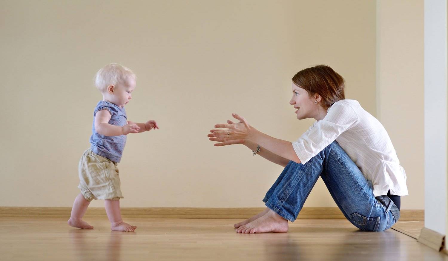 Многие дети пробуют вставать в возрасте 9-10 месяцев. Для того чтобы оставаться в вертикальном положении они используют любой предмет мебели, а также помощь мамы или папы. Чаще всего кроха делает свои первые самостоятельные шаги в 12-14 месяцев, а некоторые особенно активные детки поднимаются в 7 месяцев.