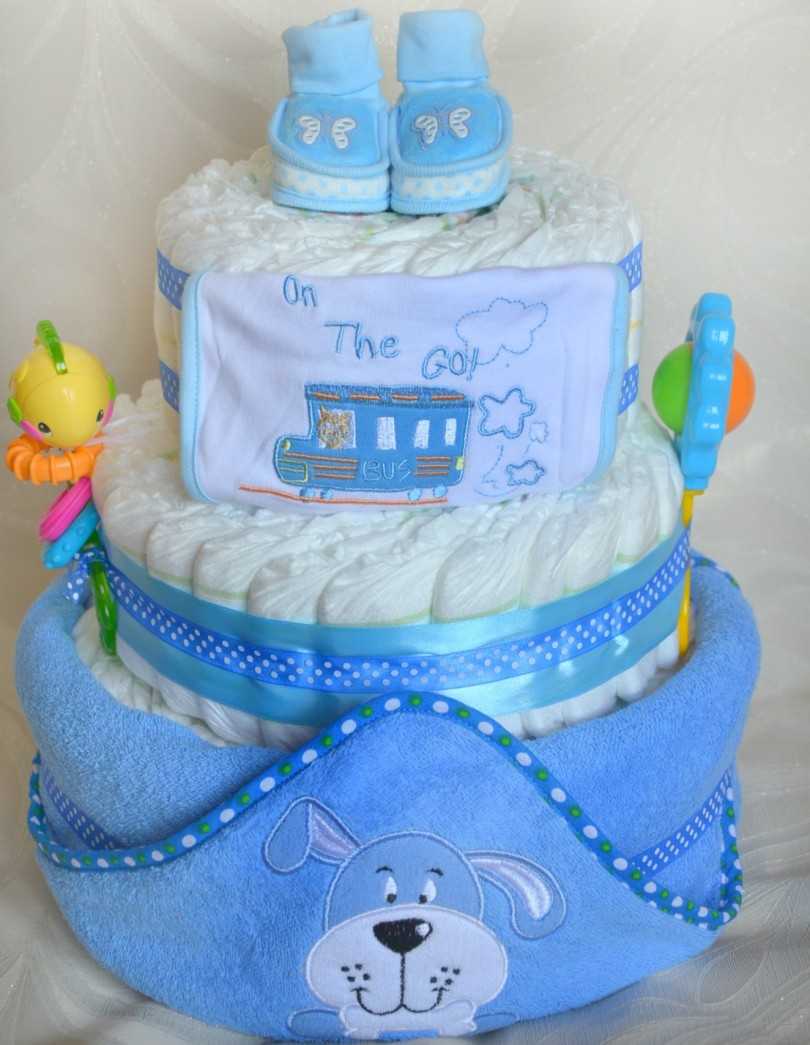 Кстати, трубочки можно делать не только из подгузников, но и из маленьких полотенец, пеленок, детских вещей, а можно и вовсе для составления ряда использовать небольшие детские игрушки. Таким образом часто оформляют один из ярусов (обычно верхний, небольшой).