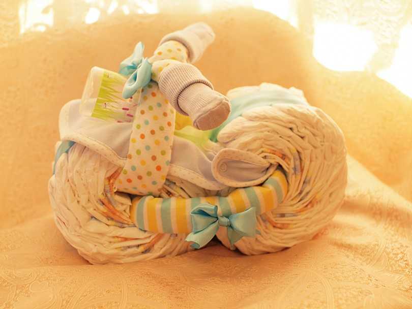 Будущий байкер через годы с улыбкой посмотрит на фото своего первого транспортного средства — мотоцикла из памперсов. Для работы понадобится 2 упаковки подгузников (в синей цветовой палитре), две пеленки и одно полотенце, бутылочка для смеси, канцелярские резинки, два слюнявчика, широкая декоративная лента с «мальчуковым» принтом, носочки, картон, булавки и двусторонний скотч.