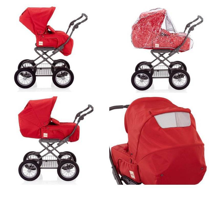 - Аксессуары в комплекте: 2 накидки на ноги, сумка для мамы, дождевик, москитная сетка на люльку, корзина для продуктов