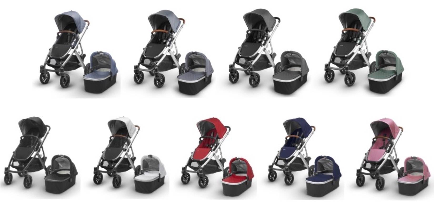Коляска Uppababy Vista 2018 представлена в 9 основных цветах: это два оттенка серого цвета, антрацит, зеленый, черный, белый, красный, темно-синий и розовый. Из них первые 4 оттенка — меланжевые.