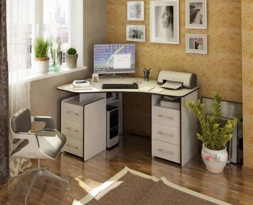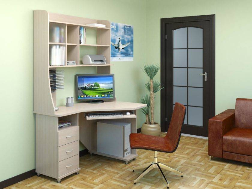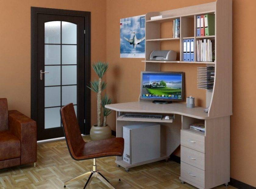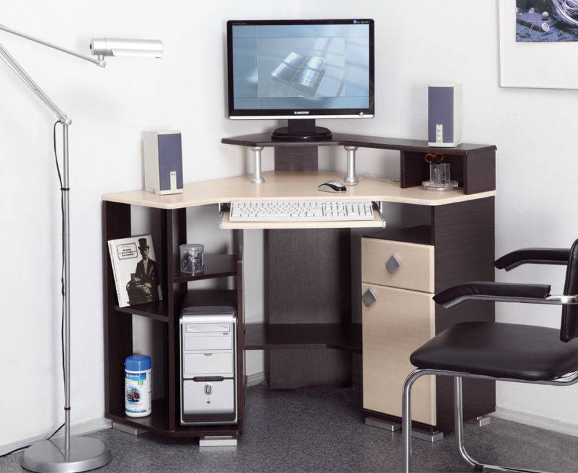 Диагональное размещение возле углового стола. Компактный вариант, позволяющий своей конструкцией, поместится в самую малогабаритную комнату. Но учтите что возможности стола минимальные через размеры.