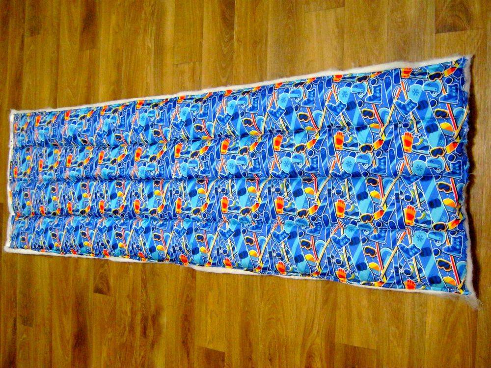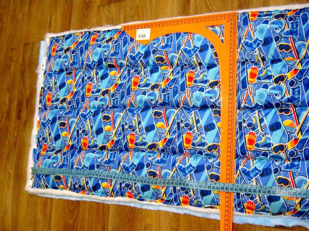 1. Для раскройки полотна нам не потребуется выкройка, потому что детали изделия делаются очень просто. Из хлопковой ткани вырезаем квадрат со стороной 100 см. Получившуюся деталь нужно будет расчертить на более мелкие квадраты или прямоугольники, для того чтобы в последствие простегать хлопок вместе с утеплителем.